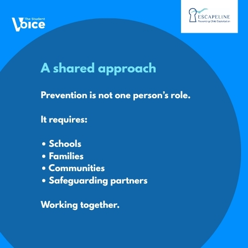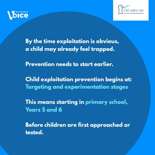 By the time exploitation is obvious, a child may already feel trapped. Child exploitation prevention must begin earlier, at the targeting and experimentation stages, and crucially, this means starting in primary school, particularly in Years 5 and 6, before children are first approached or tested. Child exploitation prevention must involve schools, families, communities and safeguarding partners working together.